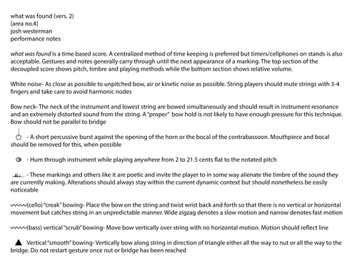 What Was Found is a time-based piece for 16 players. The score is derived from a 30 minute field recording taken in Brooklyn, NY during the winter of 2016. The composition doesn't attempt to imitate the sounds of the recording but rather constructed to mirror the affect of different regions of it. The quiet streets of Bushwick become creaks and pops from the orchestra and a subway ride becomes a drawn out microtonal drone. The players are set up so that every string instrument has a duplicate at the other side of the ensemble so that sounds and events can be spatialized.